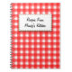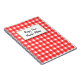 A custom recipe notebook with retro script letters on a faux doily and a country red and white plaid pattern with overlapping thick and thin stripes.