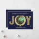 Personalised Christmas card with your reptile pet's photo, the word joy, and a navy blue and gold coloured design. Personalise this animal-themed card with a festive Holiday message. To add extra text on the back please click the button to edit the design.