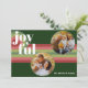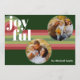 Contemporary classic Christmas holiday season greeting card with light and dark green, pink, and red coloured abstract pattern with crisp white JOYFUL wish text. With room to customise or personalise with two photos, a family name (or individual names) on the front, and a customisable season greeting message on the backside of the card.