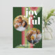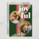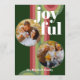 Contemporary classic Christmas holiday season greeting card with light and dark green, pink, and red coloured abstract pattern with crisp white JOYFUL wish text. With room to customise or personalise with two photos, a family name (or individual names) on the front, and a customisable season greeting message on the backside of the card.