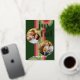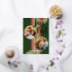 Contemporary classic Christmas holiday season greeting card with light and dark green, pink and red coloured abstract pattern with real gold foil JOYFUL wish text. With room to customise or personalise with two photos and family name (or individual names) on the front, and a customisable season greeting message on the backside of the card.
