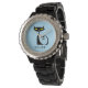 This personalised rhinestone black enamel watch design features a retro mid century modern "atomic" black cat with big yellow eyes and a curly tail.