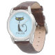 This personalised classic brown leather watch design features a retro mid century modern "atomic" black cat with big yellow eyes and a curly tail.