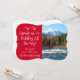The right side of the card features your river photo. The left side is a festive red background with all the text overlaid in this area.
