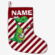 Christmas stocking with red and white candy cane stripes with a green dinosaur cartoon playing an electric guitar. Personalise with your child's name.