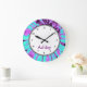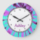 Super cool girly clock has a cool teal and purple tie dye design on the clock face in this decorative wall decor clock that is designed for a girl room, baby girl room, baby boy room or a college door room. Customise the name with whatever you like. You can also change the font. What a Great Gift!