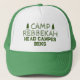 Headed to the woods for camping themed bach? Dress the bride and all her campers in this rustic retro Camp Bachelorette trucker hat. Forest Green distressed text and pine tree accents look just like they would at a 70s or 80s sleepaway camp. Customise your Camp Bach name with the bride's name. Two additional lines of text are available to personalise with roles/titles, location or name on the second line. Have fun with this!