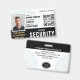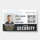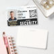Personalised private security ID badge with a modern geometric design. This editable template includes your ID photo, name, employee number, job title, company name, expiration date, logo and a QR code or barcode. Ideal for various workplaces and roles such as private security guard, close protection officer, store security, personal bodyguard, official doorman, retail worker, medical staff pass, and more. Printed colours: blue, gold, black and white. Shop the collection for more badges and tags for sale online, designed for the security service industry.