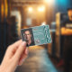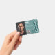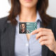 Custom teal photo ID badge template designed for security officers, event staff, and company employees. Features space for photo, name, ID number, expiration date, QR code, and company logo. Bold teal background with modern security panel for a professional and trustworthy look.