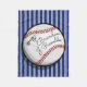 A fun fleece blanket featuring a custom signature and jersey number marked on top of a floating baseball. Behind the baseball are grey and navy pattern stripes. A cool and unique gift to your future all-star who will be signing baseballs of their own one day.