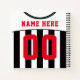This design is a soccer / football style jersey with black vertical stripes and black trim, the background colour can be changed, just click on CUSTOMIZE.