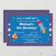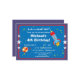 This fun birthday party invitation features a rocket ship blasting off and a polka dot planet on a blue outer space background with stars. Completely customisable.