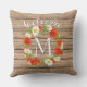 Fun and cute outdoor throw pillow with white and yellow Daisies, and red Poppy flowers wreath, on a vintage weathered looking farmhouse style wooden planks pattern. With room to customize or personalize with family monogram or initial of your choice.