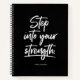 Empower your daily routine with this modern motivational notebook featuring the inspiring quote "Step Into Your Strength" in simple black and white. Designed with casual handwritten script typography, it’s a clean and elegant way to stay focused, whether for journalling, planning, or gifting. Personalise with your name or a custom message.