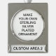 Custom printed personalized STERLING SILVER PLATED CHRISTMAS TREE ORNAMENT DECORATION Blank Template - 2.4" high x 1.95" wide x 0.08" thick. Design, create, make your own. Your photo, image, text, logo, graphics in full color print in the round image section and in the text area below. Fade-proof seal with a UV-resistant coating, silver ribbon included.