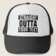 Personalised STRAIGHT OUTTA Trucker Hat with our template. Make your own custom STRAIGHT OUTTA cap design. Funny parody design with big letters. Add your own city, parody or quote to this template. Cute black and white internet meme gift idea for men, women and teen kids. Cool personalised examples: Straight outta bed. Straight outta money. Straight outta ideas. Straight outta coffee. Straight outta prison. Straight outta the gym. City and Country names; Compton, London, Paris, Colombia, Brazil, Chicago, New York, LA, Boston, Brooklyn, Europe.