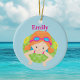 Cute swimmer with red headed pigtails in an inner tube floating on a pretty blue background of water. Customised with your little girl's name in hot pink. A great gift for someone on a swim team or who loves the pool in summer. Image by prettygrafik.com