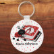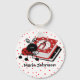 Great teacher's key chain, with graphic artwork of a stack of books, with a cute ladybug next to them, against a red and white polka dot background. Personalise the black text with your teacher's name. Perfect little gift for that special teacher.