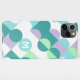 Beautiful contemporary teal blue, light green, white, and violet lavender purple coloured geometric circles, and half circles pattern on a crisp white background. With the option to customise or personalise with a name monogram or initials of your choice. Ornate, elegant, stylish and eclectic design for the fancy artistic fashionista, the artsy fashion diva, popular hip trendsetter, vintage retro art style, and abstract digital geometric motif lover. This design is available in Apple iPhone 6, 7, and 8 Plus, 10 or X, XR, XS, 11, 12, and 13 Mini, 14, 15 Plus, and Pro Max cellphone cases. Show off your style, look fashionable trendy, and feel stylish with a unique design on a mobile device accessory of your choice.