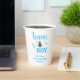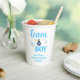 Team boy paper cups for a gender reveal party. Modern design in blue with a stork delivering a baby. Personalise it with the soon-to-be parents' names and the date. Coordinating design in pink with team girl available in the collection.