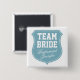 Custom Team Bride buttons for bachelorette / bridal party. Turquoise and white colour. Personalizable names for bride, bridesmaid, maid of honour, friends, family etc. Cute design for girls night before the wedding. Beautiful shield emblem with elegant script letters.