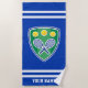 Custom tennis beach towel with crossed racket logo. Personalised blue beachtowel with athletic stripes and typography. Add your own funny quote, name or monogram letters. Cool Birthday gift idea for teen children, legendary dad, best husband, super grandpa, son, father, new daddy, world's greatest uncle, stepdad, brother, retired friend, groom, boss, co worker, colleague, sports coach, personal trainer, fitness instructor, pensioner, player, athlete, fan, teenager, kids, boy, girl etc. Fun summer accessories for beach or pool. Sporty design with customisable background colour. Crossed rackets logo and 3 yellow tennis balls on shield emblem.