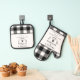 Make these beautiful black and white chequered pattern oven mitt and/or pot holder your own, with the ability to customise all four text areas with your own message! Design with a beautiful area for your text, enhanced with a spatula, mixing bowls, fork, and whisk details. Unique great gift idea! A matching apron is also available.
