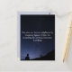 Focus on enlightenment and healing with this fully customisable postcard. This card features a Carl Jung quote with a person contemplating the vast sky with its lovely dark blue and purple stars and space tapestry. There is a spot in the centre that can be personalised with your own text. The default text says "One does not become enlightened by imagining figures of light, but by making the darkness conscious" by famed psychologist and philosopher Carl Jung in white script. Hit the Personalise button to edit the text if you wish, or hit the Customise button to change the back side colour, font, size, or font colour. Makes a great inspiring decoration or gift! Great for lovers of Carl Jung, astronomy, psychology, seekers of enlightenment, truth, healing, therapy, and wellness.