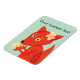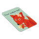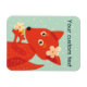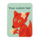 Cute fox magnet with a vector illustration of a cartoon fox with big eyes and flowers on her head, holding a bunch of flowers in her paws. This cute magnet has customisable text. The artwork has cheerful bright orange and light blue colours and is simply fun. It has light blue background with almost white polka dots.