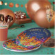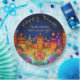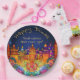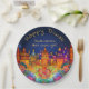 A vibrant Diwali celebration captured on a paper plate. The plate features a dark blue background with a stunning illustration of an Indian palace skyline lit up by colourful fireworks. At the centre, a beautiful lotus flower adds a touch of elegance and spirituality.