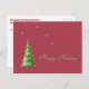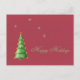 "Happy Holidays" postcard with red paper background featuring a decorated fir tree and snowflakes.