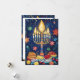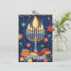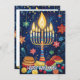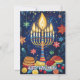 This Hanukkah greeting card is a vibrant celebration of the Festival of Lights, featuring a beautifully illustrated menorah with glowing candles against a deep blue night sky. Surrounding the menorah are festive symbols like dreidels, gold coins (gelt), and sufganiyot (jelly-filled doughnuts), all adding to the joyous atmosphere. The background is sprinkled with stars and ornaments, enhancing the festive feel.