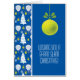 PLEASE CUSTOMIZE BOTTOM TEXT INSIDE! a Christmas greeting card that captures the festive spirit of padel! The front of the card features a playful pattern set against a vibrant blue background, adorned with padel rackets decorated like Christmas trees, shiny ornaments, and icy snowflakes. The rackets, with their subtle stripes and ornamented trees, give the impression that Santa has swapped his sleigh for a quick doubles game.