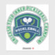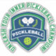 Customisable text. Bright green, navy blue and dark green pickleball with two white crossed pickleball paddles and lime green pickle ball.