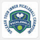 Customisable text. Bright green, navy blue and dark green pickleball with two white crossed pickleball paddles and lime green pickle ball.