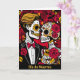 The Greeting Card showcases a mesmerising scene against a deep black backdrop. At its heart, two lovers engage in a passionate exchange, their eyes locked in a captivating gaze that communicates a timeless connection. The infusion of red, yellow, and white pop art elements electrifies the composition, bringing dynamic energy to the traditional Día de Muertos theme. The bold use of colours accentuates the figures' intensity and emotions, with red, yellow, and white accents enlivening their forms against the dark canvas. This pop art interpretation breathes contemporary vibrancy into the cultural celebration.