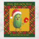 A wine bottle label featuring a jolly pickle, decked out in Santa's hat, and skilfully wielding a pickleball paddle while serving up some holiday cheer! The background is a vibrant yellow, red, and green plaid, adorned with beautiful poinsettia flowers. With custom text options at the top and bottom, you can add a personal touch to make it uniquely yours. It's the perfect blend of festive fun and practicality, making your wine gifts a little more merry. 🎅🏓