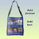Upload six of your favourite photos, and they will appear on both the front and back of this navy tote bag. Don't worry if yours aren't exactly square - they will be automatically cropped to fit. The text is editable: the sample shows "Smiles and hugs!" on the front, and "Wonderful World" on the back. Stylised poinsettia flowers give added winter decoration. [Photography © Storytree Studios, Stanford, CA]