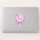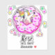 Cute and fun dancing Unicorn with rainbow hair doing the dab dance pose and popping out of a Pink Iced cartoon Doughnut with confetti stars and sprinkles. Customisable text with any name, personal message or quote.