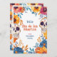 The “Vibrant Traditions - Personalised Dia de Muertos Card” is a flat greeting card designed for the Dia de Muertos celebration, featuring a vibrant and colourful border made up of traditional Mexican marigold flowers and foliage, with two decorated sugar skull illustrations symmetrically placed at the top and bottom centre; the background is a clean white that makes the colours pop; in the centre, there is text that reads “Feliz Dia de los Muertos” in an elegant, bold font, followed by “from [custom name]” indicating that this part of the text can be personalised; the design suggests that the back of the card would have space for a custom message and would likely feature the same floral and skull motifs against a white background to maintain consistency with the front design.