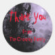 A custom Thank You sticker with red scratchy letters, gothic ravens, misty trees and a cloudy full moon with a purple misty sky.