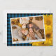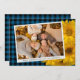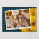 Unique, classy, trendy, pretty and decorative Thanksgiving holiday card. With room to customise or personalise with a photo and names (or family name) of your choice. With cute classic warm yellow fall Mums flowers on rustic farmhouse inspired tartan plaid pattern background design. And a customisable season greeting poem on the backside of the card.