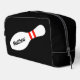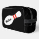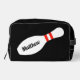 Custom toiletry bag with bowling pin design. Cool gift idea for bowler. Black or custom colour Dopp Kit. Personalise with name or monogram.