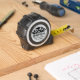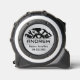 Custom tape measure design for a handyman, general contractor, or mechanic features a silver background and tools design with wrench, drill, hammer and saw framing a first name that can be personalised. Also includes text for a business name, phone number, or other contact information.