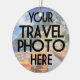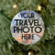 Custom Travel 2 Photo Script Modern Christmas Ornament - If you've travelled this year on vacation and want to remember a special place, make your own ornament to remember the trip with this unique personalised Christmas keepsake ornament featuring two of your own travel photos, as well as your travel location and the year of your travel in trendy hand lettered script typography. Easy to customise with your travel location, date of travel, and two of your own photos.