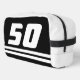 Custom travel toiletry bag for men's 50th Birthday. Personalised Dopp kit with custom age number. Cool Father's Day or Birthday gift idea for men.
