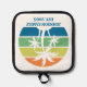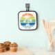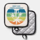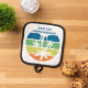 This cool personalised tropical beach house pot holder features 3 palm trees silhouetted against an orange and blue sunset accented with yellow and green at the coast. Customise this coastal family home gift for your summer getaway on the island.