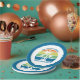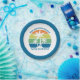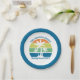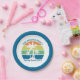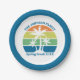 These cool personalised tropical beach sunset party paper plates feature 3 palm trees silhouetted against an orange and blue sky accented with yellow and green at the coast. Customise with your family trip name for your coastal getaway this spring break or summer or ocean cruise vacation.
