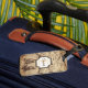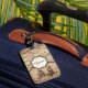 This luggage tag features a vintage map with sepia markings. The initial letter and name are set within a double-edged black frame with a white centre. The initial letter, in tan, is set behind the name in dark brown. One or the other of the text items can be removed.