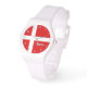 Custom watch with Danish flag of Denmark. Personalizable with name or monogram letters. Cool personalised watches with patriotic design. Novelty Birthday gift idea for friends, coworker, boss, son, daughter, husband, wife, brother, sister, dad, mum, colleague, kids, grandchildren etc.